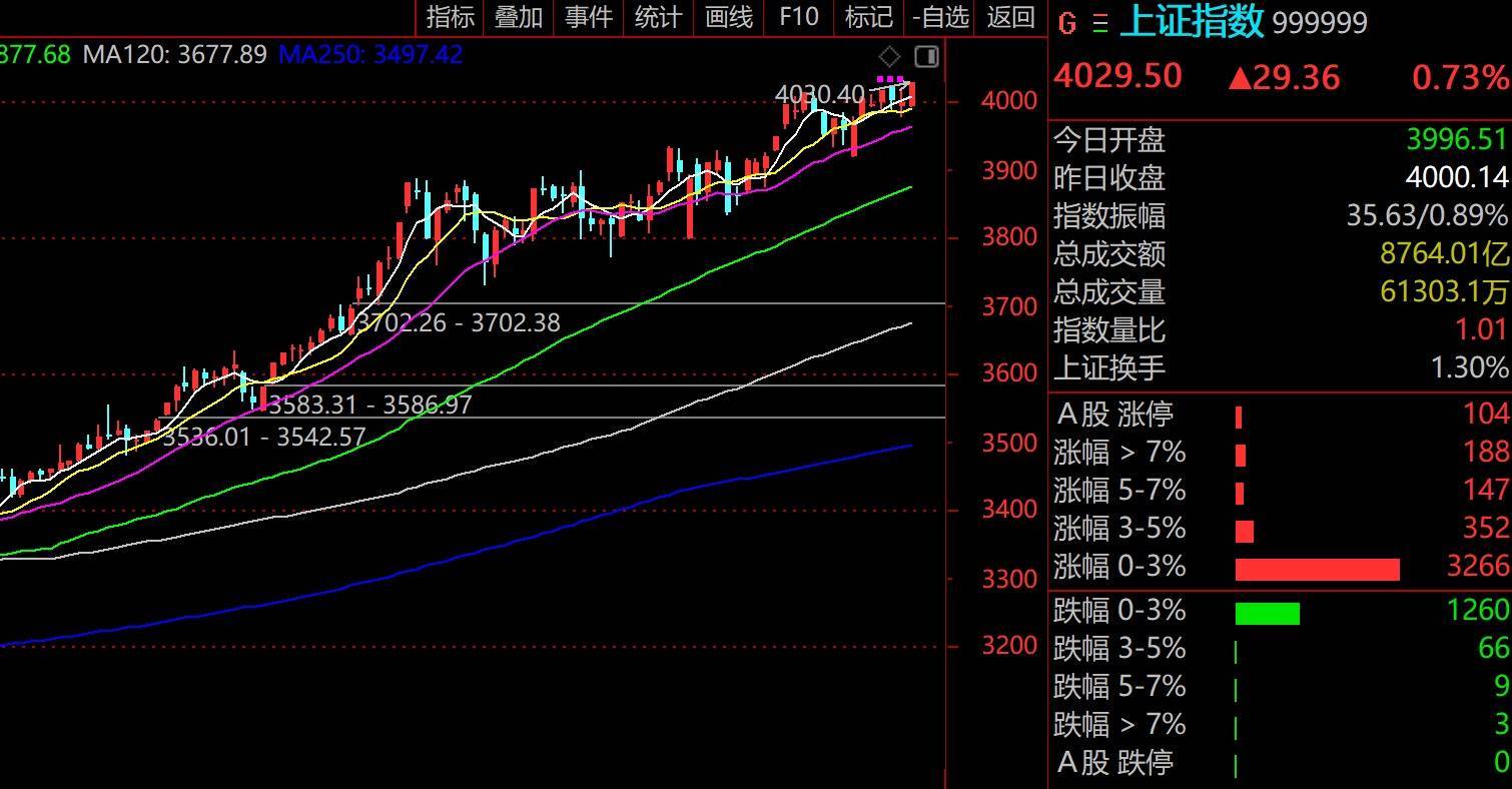 周四,A股稳步上行再创10年新高,市场呈现普涨格局。交易所数据显示,上证指数收涨0.73%,报4029.5点;深证成指涨1.78%,报13476.52点;创业板指表现强势,大涨2.55%,报3201.75点;科创50涨1.44%,报1399.29点。