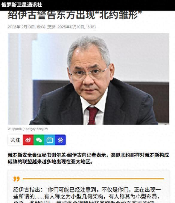 高市早苗政府加速复辟军国主义的行为,已经引起了中俄朝缅等国家的一致警觉。 12月10日,俄罗斯卫星通讯报道称,俄罗斯安全会议秘书绍伊古表示,类似北约那样对俄罗斯构成威胁的联盟,正越来越多地出现在亚太地区。